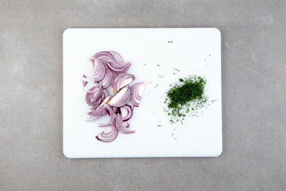 Die Zwiebeln schälen, halbieren und in dünne Streifen schneiden. Die Dillspitzen abzupfen und fein schneiden.