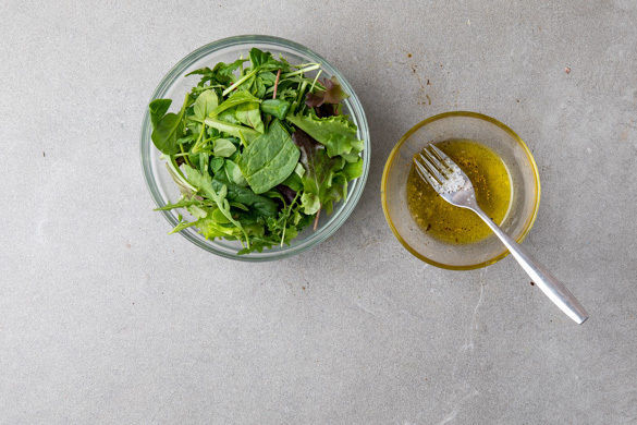 Nach ca. 5Min. Backzeit die Flammkuchen mit dem Feta und dem restlichen Thymian bestreuen und goldbraun fertig backen. 1–2EL Olivenöl, 1EL Essig, Salz, Pfeffer und Zucker nach Geschmack zu einem Dressing anrühren und mit dem Salat mischen. Die Flammkuchen mit dem Pesto, dem Honig und den restlichen Walnüssen garnieren und mit dem Salat servieren.