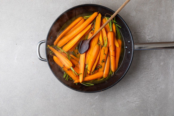 Bundmöhren sind nicht nur ein besonders hübsches Sommergemüse. Aus ihrem zarten Grün lässt sich ein leckeres Pesto zubereiten, das perfekt mit den süßen, gebackenen Karotten, dem leicht salzigen Feta und dem erdigen Thymian harmoniert. Eine köstliche Geschmackskombination, von der man nicht genug bekommen kann. Von diesem reichhaltigen Gericht kannst du übrigens noch gut eine Portion für die nächste Mittagspause abzweigen.