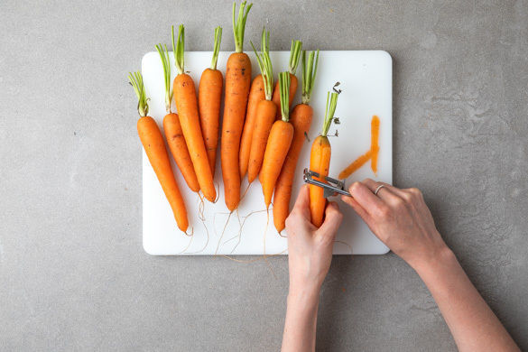 Den Backofen auf 220°C Umluft (240°C Ober-/ Unterhitze) vorheizen. Die Thymiannadeln von den Stängeln zupfen. 70g des Karottengrüns für das Pesto beiseitelegen. Die Karotten schälen, dabei aber ca. 3cm des Karottengrüns an den Karotten lassen. Anschließend die Karotten längs halbieren. Den Knoblauch schälen und fein reiben.