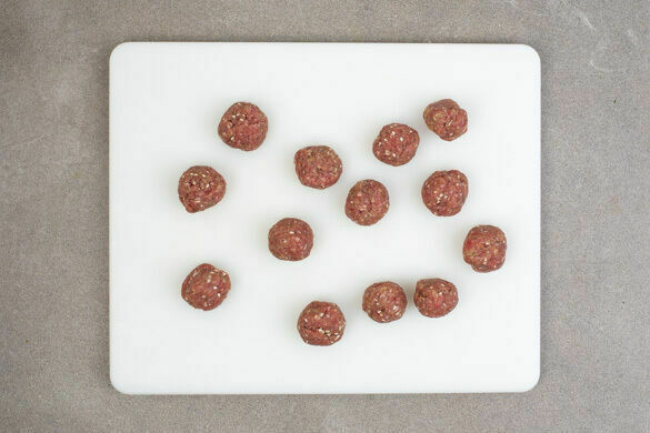 Das Hackfleisch mit dem Knoblauch, dem Ingwer und dem restlichen Sesam vermengen und gut durchkneten. Mit feuchten Händen etwa walnussgroße Bällchen formen.