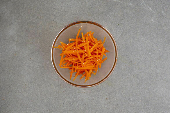 Ca. ⅔ des Sesamöls mit 1TL Sesam, 2EL hellem Essig, ½TL Zucker und je 1 kräftigen Prise Salz und Pfeffer zu einer Marinade verrühren. Die Karotten ggf. schälen und grob reiben oder in sehr feine Stifte schneiden. Die Karotten mit der Marinade vermengen.
