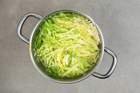 Die Nudeln und den Weißkohl in das kochende Wasser geben und in 5–6Min. bissfest kochen. In ein Sieb abgießen und kalt abschrecken.