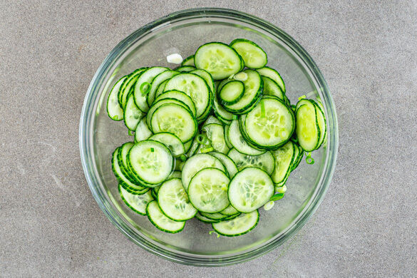 1L Wasser in einem Wasserkocher aufkochen. Inzwischen 2TL Zucker und 1TL Salz in 4EL hellem Essig und 2EL Wasser auflösen. Die Gurke in dünne Scheiben schneiden, die Lauchzwiebeln in feine Ringe schneiden. Beides mit dem Einlegesud vermengen und bis zum Servieren beiseitestellen.