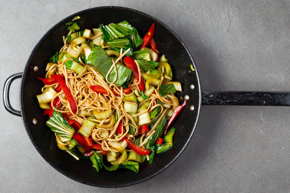 Die Paprika in einer großen Pfanne oder einem Wok mit 1EL Pflanzenöl bei mittlerer Hitze ca. 3Min. braten. Den Pak Choi und 1 Prise Salz zugeben und ca. 2Min. mitbraten. Die Nudeln mit der Würzsauce und der übrigen Marinade untermengen. Bei starker Hitze 2–3Min. einköcheln lassen, dann mit Salz abschmecken. Die Spieße auf dem Gemüse-Nudel-Mix anrichten und servieren.