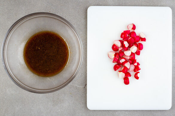 Das Sesamöl mit der Sojasauce, der Limettenschale, dem restlichen Knoblauch und Ingwer sowie 2TL Honig, 1EL Essig (z. B. Reisessig) und 1–2EL Wasser zu einem Dressing verrühren. Die Radieschen je nach Größe halbieren oder vierteln.