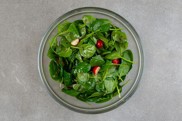 Das Fleisch nach 25–30Min. Garzeit aus dem Ofen nehmen und beiseitestellen. ⅓ des Spinats mit dem Gemüse und dem Bratensaft vermengen und im Ofen ca. 5Min. weitergaren.