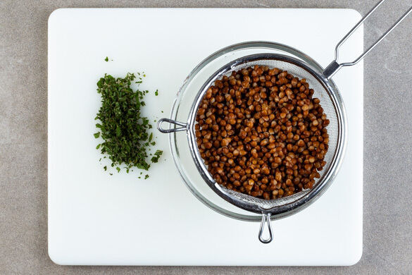 Die Petersilie samt Stängeln fein hacken und mit 4EL veganer Mayonnaise und 1½EL Essig verrühren. Das Dressing mit Salz und Pfeffer abschmecken.
