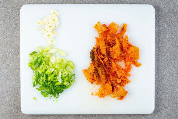 Das Kimchi grob klein schneiden. Die Lauchzwiebeln schräg in dünne Ringe schneiden. Den Knoblauch schälen und in feine Scheibchen schneiden.