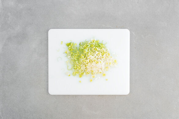 In einem großen Topf ausreichend gesalzenes Wasser für die Pasta zum Kochen bringen. Den Lauch längs halbieren und quer in dünne Streifen schneiden.