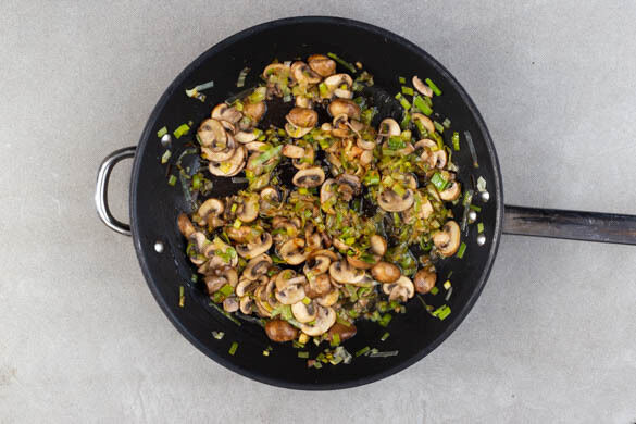 Die Pilze zum Lauch in die Pfanne geben und 4–5Min. mitbraten, bis sie schön gebräunt sind. Dabei ab und an umrühren.