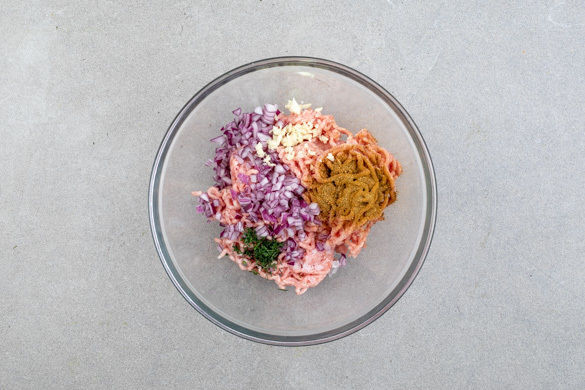 Das Hackfleisch mit den Zwiebelwürfeln, der ½ des Knoblauchs und ca. ⅓ des Dills gut verkneten und mit der Gewürzmischung sowie 1 kräftigen Prise Salz würzen. Mit den Händen 6–8 gleich große Hackbällchen formen.