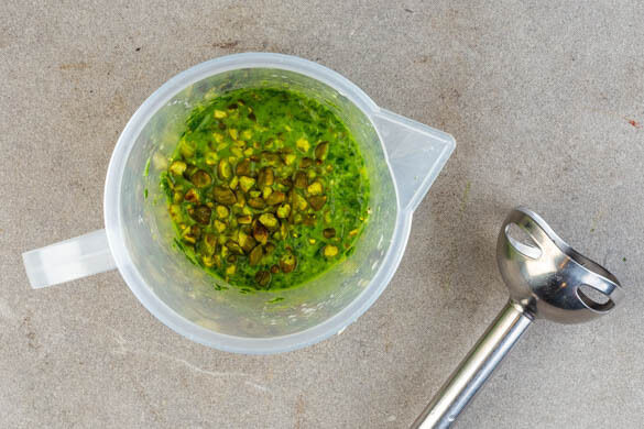 Die Pistazien grob hacken. Die Petersilie samt Stängeln grob schneiden. Die Zitronenschale abreiben, dann die Zitrone halbieren und auspressen. Die Petersilie, den Knoblauch, ½TL Zitronenschale, ½–1EL Zitronensaft und 2EL Olivenöl in einem hohen Gefäß pürieren, dabei ggf. esslöffelweise Wasser zugeben. Die Pistazien mit der Gremolata vermengen.