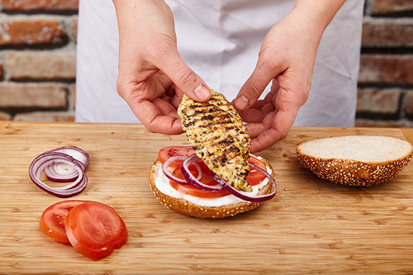 Die Burgerbrötchen aufschneiden und beide Hälften mit etwas Estragonjoghurt bestreichen. Mit den Tomaten, den Zwiebeln und dem Fleisch belegen. Wer mag, kann das Fleisch einmal halbieren. Die Karotten-Pommes mit Salz und Pfeffer würzen und mit dem restlichen Joghurt zu den Hähnchenburgern servieren. Die BBQ-Sauce als Dip dazu reichen.