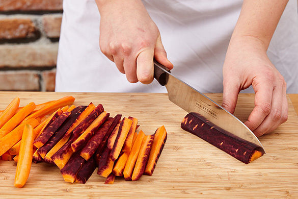 Den Backofen auf 220°C Umluft (240°C Ober-/Unterhitze) vorheizen. Die Karotten schälen und in 1–2cm dünne, pommesartige Spalten schneiden. Auf einem mit Backpapier ausgelegten Backblech mit 1EL Olivenöl vermengen und 20–25Min. im Ofen backen, bis die Karotten knusprig und gar sind. Nach der Hälfte der Zeit einmal wenden.