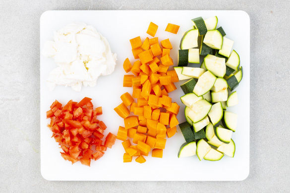 Die Zucchini längs vierteln und in ca. 1cm breite Stücke schneiden. Die Karotte ggf. schälen, längs vierteln und in kleine Würfel schneiden. Die Tomate vierteln, vom Kerngehäuse befreien und ebenfalls in kleine Würfel schneiden. Den Mozzarella in dünne Scheiben schneiden.