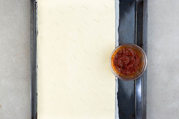 Das Tomatenmark mit der Gewürzmischung, 2EL Olivenöl, 4EL Wasser sowie je 1 kräftigen Prise Salz und Pfeffer zu einer Sauce verrühren. Die Teige mit dem Papier nach unten auf zwei Backblechen ausrollen und mit einer Gabel mehrere Male einstechen.