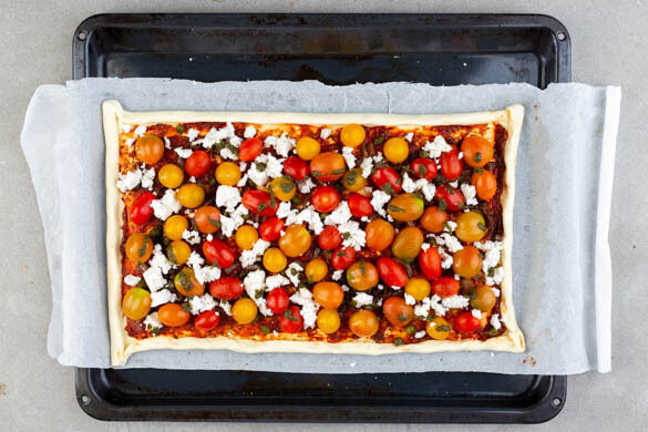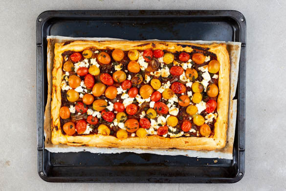 Die Tarte im Ofen 12–18Min. backen, bis die Kirschtomaten beginnen aufzuplatzen und der Teig goldbraun und an den Rändern knusprig ist.