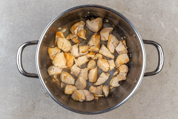 Das Fleisch trocken tupfen und in einem großen Topf mit 2EL Olivenöl und je 1 kräftigen Prise Salz und Pfeffer bei mittlerer Hitze in 3–4Min. leicht bräunlich anbraten.