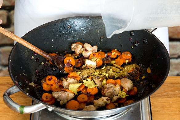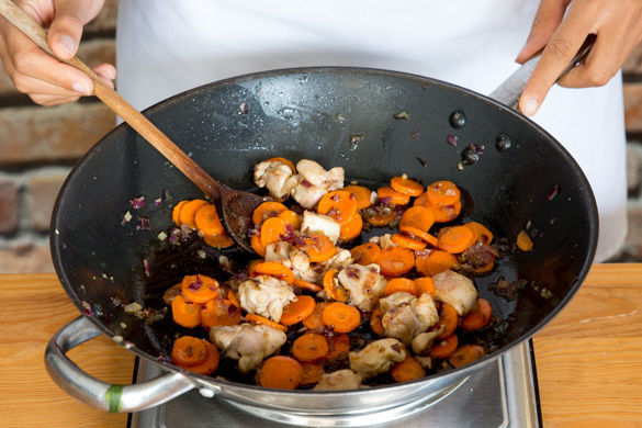 Den Speck in einer großen Pfanne ohne Zugabe von Fett 3–4Min. knusprig anbraten. Auf einem Teller beiseitestellen. Das Fleisch, die Zwiebeln und die Karotten in derselben Pfanne mit 1EL Olivenöl bei mittlerer bis starker Hitze ca. 5Min. von allen Seiten anbraten. Den Knoblauch zugeben und ca. 30Sek. mitgaren.