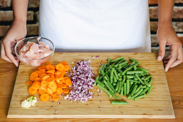 In einem großen Topf ausreichend gesalzenes Wasser für die Pasta zum Kochen bringen. Die Enden der Bohnen abschneiden und die Bohnen in 2–3cm lange Stücke schneiden. Die Karotten schälen und in feine Scheiben schneiden. Die Zwiebel und den Knoblauch schälen und in feine Würfel schneiden. Das Fleisch trocken tupfen und in ca. 2cm große Würfel schneiden.