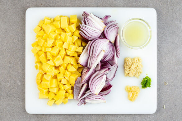 Den Backofen auf 220°C (200°C Umluft) vorheizen. Die Kartoffeln ggf. schälen und in ca. 2cm große Würfel schneiden. Die Zwiebeln schälen, halbieren und in ca. 1cm breite Spalten schneiden. Den Knoblauch schälen und fein würfeln. Den Ingwer schälen und fein reiben. Die ½ der Limettenschale abreiben, dann die Limette halbieren und auspressen.
