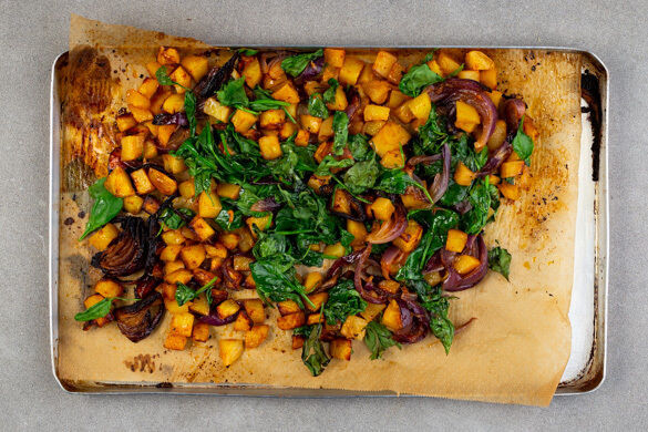 Das Fleisch nach 25–30Min. Garzeit aus dem Ofen nehmen und beiseitestellen. ⅓ des Spinats mit dem Gemüse und dem Bratensaft vermengen und im Ofen ca. 5Min. weitergaren.