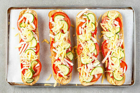 Die Süßkartoffeln aus dem Ofen nehmen. Die Sandwiches auf einem mit Backpapier ausgelegten Backblech verteilen und 3–4Min. im Ofen backen, bis der Käse geschmolzen ist.