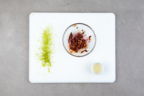 Die Limettenschale abreiben, dann die Limette halbieren und auspressen. Die restlichen Zwiebeln, den restlichen Ingwer und den restlichen Knoblauch mit der restlichen Tikka-Masala-Paste verrühren.