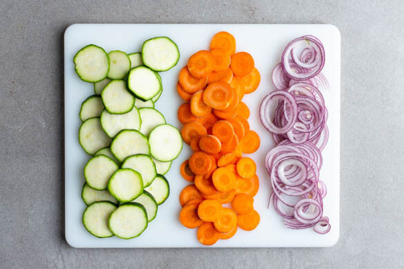 Den Backofen auf 220°C (200°C Umluft) vorheizen. Die Karotten ggf. schälen. Die Zucchini und die Karotten in dünne Scheiben schneiden. Die Zwiebeln schälen und in feine Ringe schneiden.