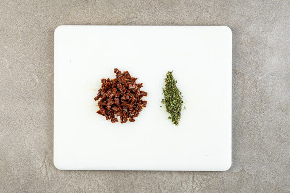 Die getrockneten Tomaten in grobe Stücke schneiden. Die Rosmarinnadeln abzupfen und ebenfalls grob schneiden.