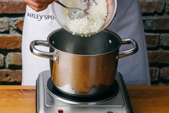 In einem mittelgroßen Topf 800ml gesalzenes Wasser zum Kochen bringen. Den Reis in einem Sieb unter fließendem Wasser abspülen, bis das Wasser klar bleibt. Sobald das Wasser kocht, den Reis hineingeben und abgedeckt bei niedrigster Hitze 10–12Min. kochen, bis das Wasser aufgesogen und der Reis gar ist. Noch ca. 5Min. ohne Hitzezufuhr abgedeckt ziehen lassen.
