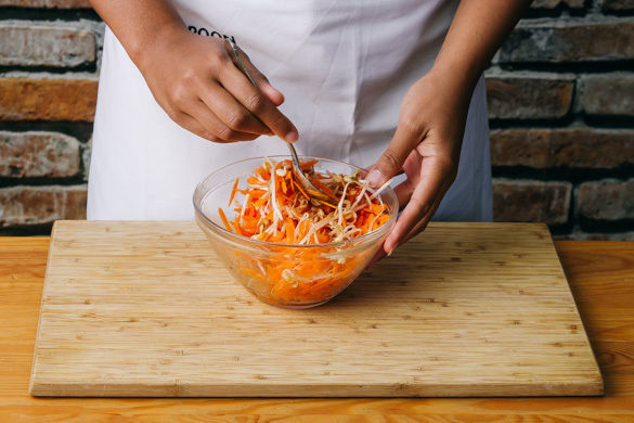 Die Sweet-Chili-Sauce mit 2–3EL Wasser verrühren. Die Gurke längs in schmale Streifen schneiden. Die Karotte erst schälen und grob reiben, dann mit den Mungbohnensprossen und der Sweet-Chili-Sauce mischen.