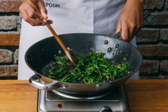 Den Knoblauch schälen und fein hacken oder reiben. 1 Handvoll Spinat in einer mittelgroßen Pfanne mit 1EL Pflanzenöl bei mittlerer Hitze zusammenfallen lassen. Den Knoblauch hinzugeben, dann den restlichen Spinat untermischen. Mit Salz und Pfeffer würzen, aus der Pfanne nehmen und beiseitestellen.