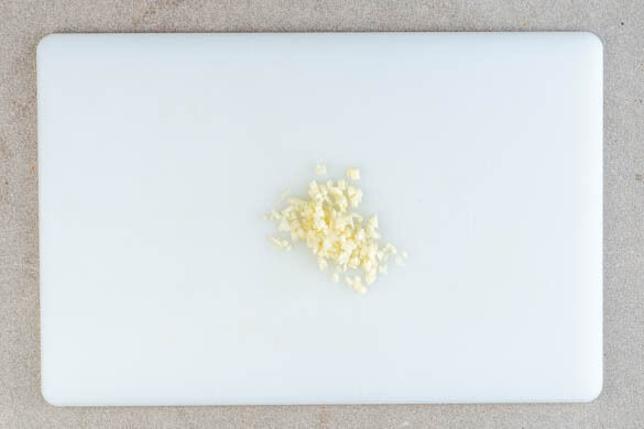 In einem Wasserkocher oder einem kleinen Topf ausreichend Wasser für die Nudeln zum Kochen bringen. In der Zwischenzeit den Knoblauch schälen und sehr fein würfeln oder durch eine Knoblauchpresse drücken.