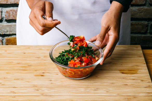 Inzwischen die Tomaten in feine Würfel schneiden, den Strunk entfernen. Die Petersilie samt Stängeln fein schneiden. Die Tomaten und die Petersilie mit 1–2EL Olivenöl sowie Salz und Pfeffer zu einer Salsa vermengen. Die Päckchen vorsichtig öffnen und mit der Tomatensalsa servieren.