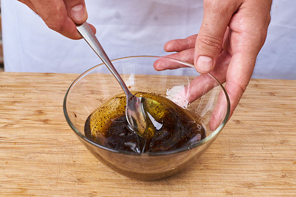1–2EL Olivenöl, 1–2EL Essig, Salz, Pfeffer und 1 Prise Zucker zu einer Vinaigrette verrühren.