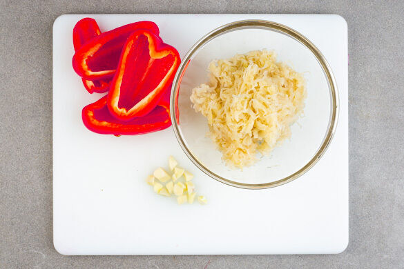 Inzwischen die Paprika vierteln und entkernen. Den Knoblauch schälen und grob würfeln. Das Sauerkraut in einem Sieb mit kaltem Wasser abspülen und abtropfen lassen.