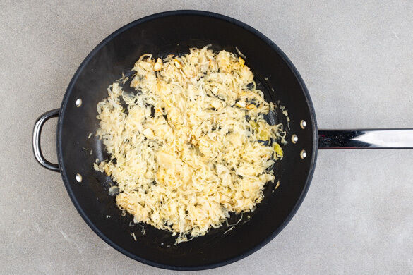 Den Knoblauch in einer mittelgroßen Pfanne mit 2EL Butter bei niedriger bis mittlerer Hitze ca. 30Sek. anbraten. Das Sauerkraut untermengen, in 1–2Min. erwärmen und aus der Pfanne nehmen. Die Pfanne auswischen.