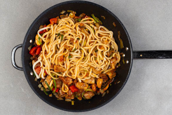 Die Nudeln und 75ml Nudelwasser in die Pfanne geben und bei starker Hitze ca. 1Min. vorsichtig mit dem Gemüse und dem Fleisch vermengen.