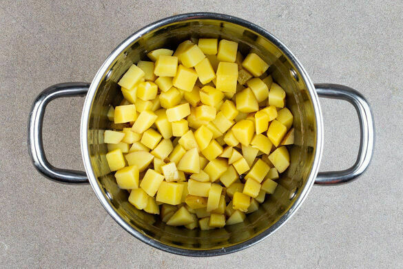 Den Backofen mit Grillfunktion oder Ober-/Unterhitze auf 200°C vorheizen. In einem mittelgroßen Topf ausreichend gesalzenes Wasser für die Kartoffeln zum Kochen bringen. Die Kartoffeln schälen, in ca. 1cm große Stücke schneiden, dann in das kochende Wasser geben und in 15–20Min. gar kochen. Tipp: Die Kartoffeln sind durch, wenn sie sich bei der Messerprobe leicht vom Messer lösen.