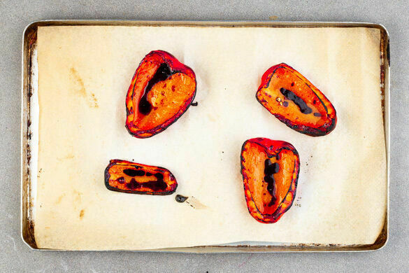 Die Paprika mit der Schnittseite nach oben auf einem mit Backpapier ausgelegten Backblech verteilen und mit der Balsamicocreme sowie 2EL Pflanzenöl beträufeln, mit 1 kräftigen Prise Salz würzen und im Ofen unter dem Grill ca. 10Min. rösten, bis die Haut anfängt, Blasen zu werfen.