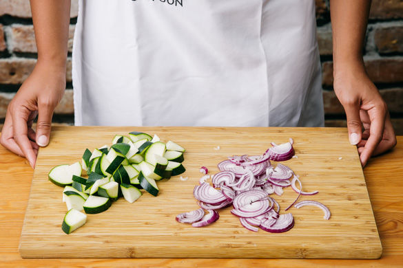 Inzwischen die Zucchini längs vierteln und in ca. 1cm breite Scheiben schneiden. Die Zwiebel schälen, halbieren und in feine Streifen schneiden.