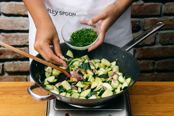 Die Zwiebeln in einer mittelgroßen Pfanne mit 1EL Olivenöl bei mittlerer Hitze 1–2Min. glasig anschwitzen. Die Hitze erhöhen, die Zucchini dazugeben und 4–5Min. mitbraten. Mit Salz und Pfeffer würzen und die Petersilie untermischen. Das Zucchinigemüse aus der Pfanne nehmen und warm halten. Die Pfanne auswischen.