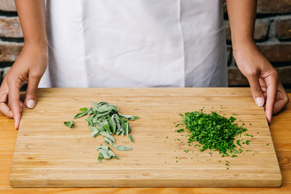 Die Petersilie samt Stängeln fein hacken. Die Salbeiblätter von den Stängeln zupfen und grob schneiden.
