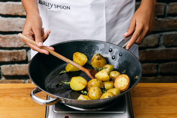 Den Backofen auf 180°C Umluft (200°C Ober-/Unterhitze) vorheizen. In einem großen Topf ausreichend gesalzenes Wasser für die Kartoffeln zum Kochen bringen. Die Kartoffeln je nach Größe halbieren oder vierteln, in das kochende Wasser geben und in 15–20Min. bissfest kochen. In ein Sieb abgießen und abtropfen lassen.