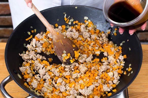Die Karotten, die Zwiebeln und den Ingwer in einer großen Pfanne mit 1–2EL Pflanzenöl bei mittlerer bis starker Hitze 2–3Min. anbraten. Das Hackfleisch dazugeben und ca. 5Min. scharf anbraten, dabei immer wieder rühren. Mit der Teriyakisauce ablöschen, alles gut verrühren und die Pfanne vom Herd nehmen. Nach Wunsch mit Salz und Pfeffer würzen.