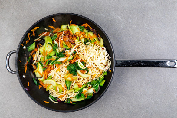 Den Pak Choi in 1–2cm breite Streifen schneiden. Die Karotte schälen und mit einer Küchenreibe grob raspeln. Die Zwiebel schälen, halbieren und in feine Streifen schneiden. Den Knoblauch schälen und in feine Scheibchen schneiden. Die Chilischote längs halbieren, entkernen und in feine Streifen schneiden. Den Koriander samt Stängeln fein schneiden.
