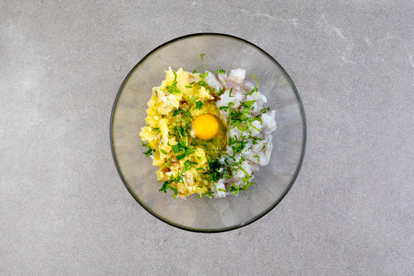 Die Garnelen trocken tupfen und grob hacken. Die Kartoffeln stampfen und mit den Garnelen, dem Koriander, 1–2EL Mehl und 1 Ei vermengen. Mit Salz und den restlichen Chilistreifen würzen. In einer großen Pfanne 1–2EL Pflanzenöl auf mittlerer Stufe erhitzen. 1–2EL Garnelenmasse pro Küchlein in die Pfanne geben und 3–4Min. goldbraun anbraten. Zwischendurch einmal wenden.