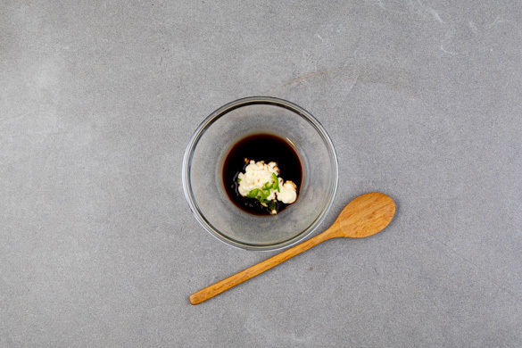 Die Mayonnaise mit 2TL Sojasauce und der 1/2 der Chilistreifen verrühren. Bei Bedarf etwas Wasser hinzufügen.